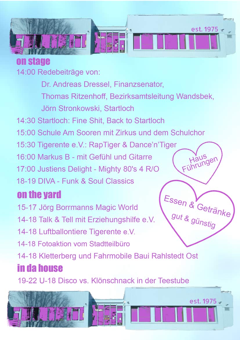 Auf dem Einweihungs- und Jubiläumsfest am 09. Mai 2026 werden wir unser schönes NEUES STARTLOCH feiern. Die Planung steht, es erwartet Euch ein buntes Programm mit Spaß, Spiel und Unterhaltung, mit günstigem Essen und illustren Gästen.