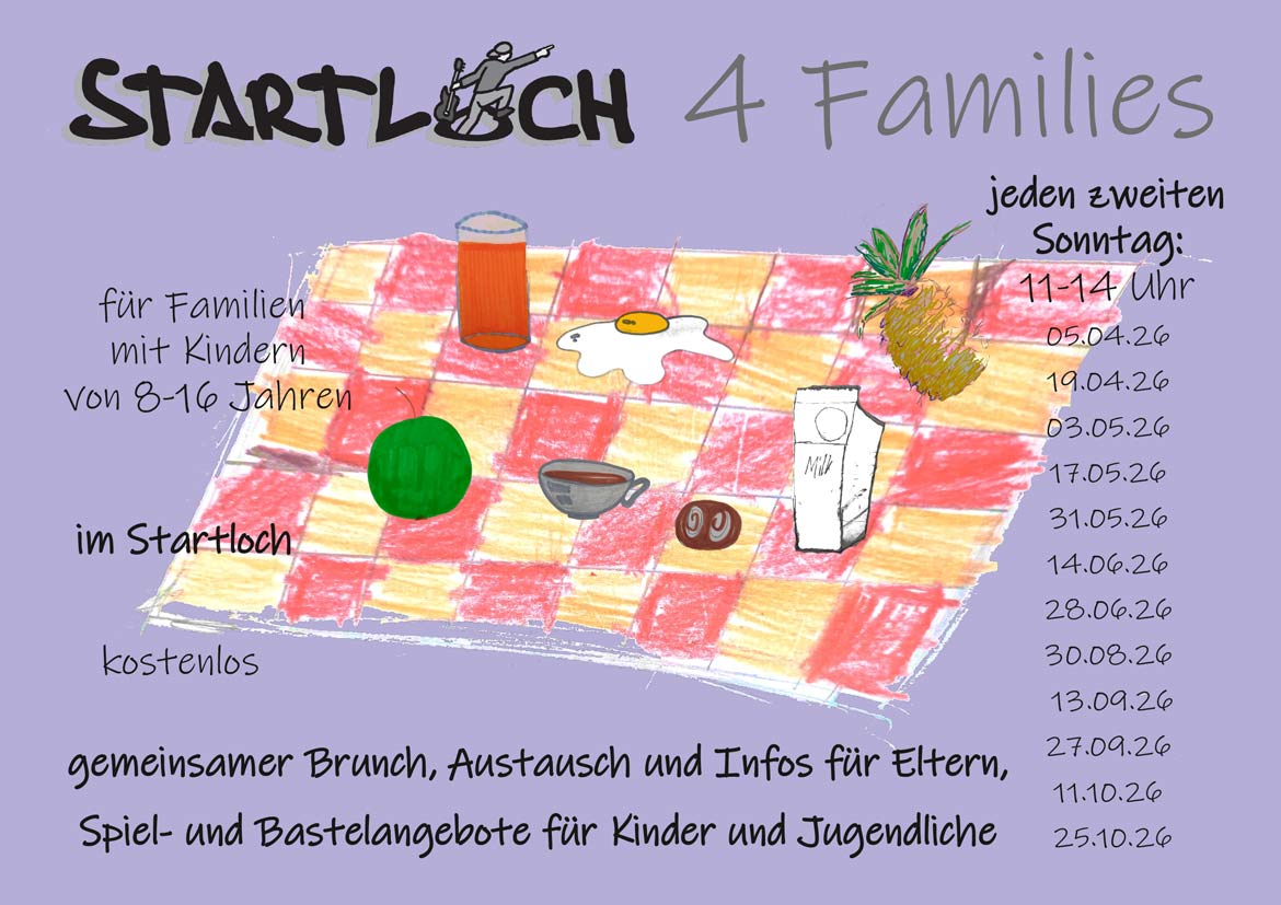 Das Angebot für Familien mit Kindern von 8-16 Jahren ist zurück: Jeden zweiten Sonntag von 11-14 Uhr findet im Startloch kostenlos ein gemeinsamer Brunch statt, mit Austausch und Infos für Eltern, Spiel- und Bastelangeboten für Kinder und Jugendliche.